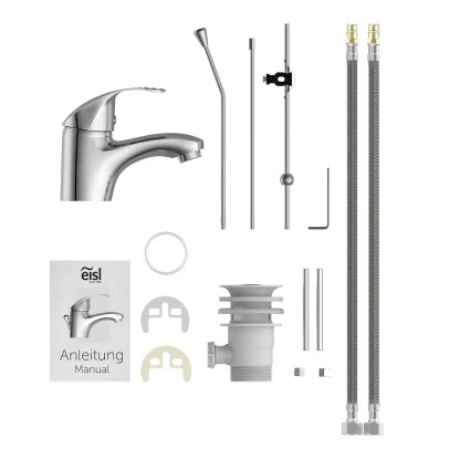 Eisl Roma Waschtischarmatur Chrom. Der Wasserhahn verfügt über eine Waschbecken Ablaufgarnitur mit Zugstange (Stangen-Exzenter) zum Öffnen und Schließen des Abfluss Stöpsels. Passend zu allen Waschtisch-Siphons mit 11/4″ – Ø ca. 4 cm Anschluss.