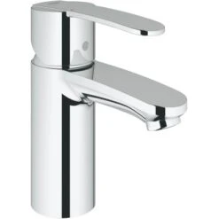 Die Grohe QuickFix Wave Cosmopolitan Einhand-Waschtischbatterie in S-Size eignet sich als Einlochmontage und verfügt über einen Bedienungshebel aus Metall. Der Körper ist glatt.