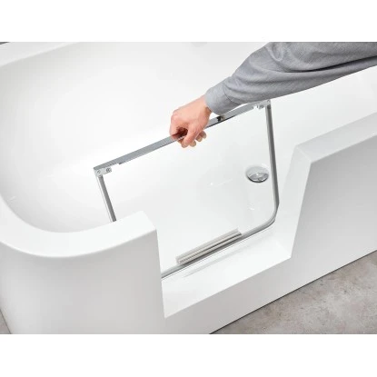 Die Tür kann zudem in der dafür vorgesehenen, magnetischen Wandhalterung sicher verwahrt werden (nicht im Lieferumfang enthalten). Des Weiteren lässt sich die Badewanne durch einen beidseitig schwenkbaren Echtglas-Wannenaufsatz (nicht im Lieferumfang enthalten) ganz einfach in eine Dusche umwandeln.