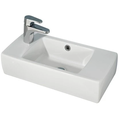 Der Waschtisch ist mit einem Überlauf ausgestattet, der bei verschlossenem Ablaufstopfen ein Überlaufen verhindert. Das vorgefertigte Hahnloch zum Anschließen einer Einlocharmatur (nicht im Lieferumfang enthalten) befindet sich auf der linken Seite des Handwaschbeckens.