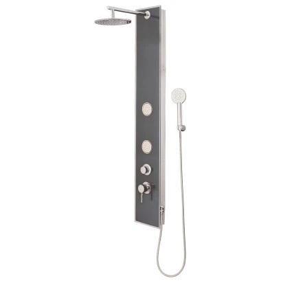 Das Duschpaneel Ibiza ist in edlem Design gestaltet und besteht aus Glas. Die Überkopfbrause und die Handbrause können Sie ganz einfach umstellen und einstellen. Beide sind zudem hochwertig verchromt. Für das besondere Wellness-Erlebnis sorgen die zwei Massagedüsen. Sie sind in Rumpfhöhe angebracht und sorgen für einen angenehmen Wasserstrahl. Wassertemperatur und -menge sind ebenfalls komfortabel einstellbar mit einem Einhebelmischer.