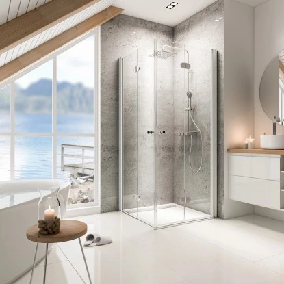 Der Eckeinstieg mit Drehfalttür der Serie Garant von Schulte ist eine platzsparende und zugleich optisch ansprechende Lösung für kleine Bäder. Die beiden formschönen, nach innen öffnenden Drehfalttüren bilden im geöffneten Zustand einen geräumigen Einstieg, der Ihr Bad zu keiner Zeit räumlich einschränkt.