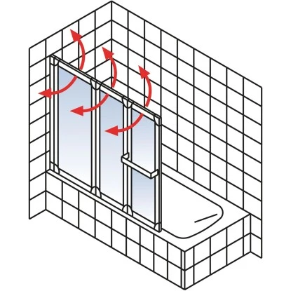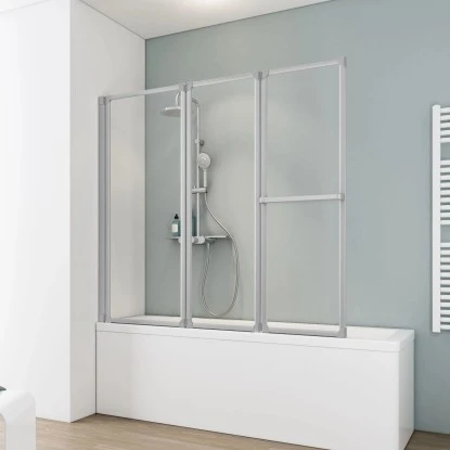 Diese dreiteilige Badewannenfaltwand von Schulte zeichnet sich insbesondere durch ihre dominante Rahmung aus. Außerdem können die einzelnen Elemente für eine optimale Raumnutzung, auch in kleinen Bädern, um 360° gedreht und platzsparend an die Wand gestellt werden.